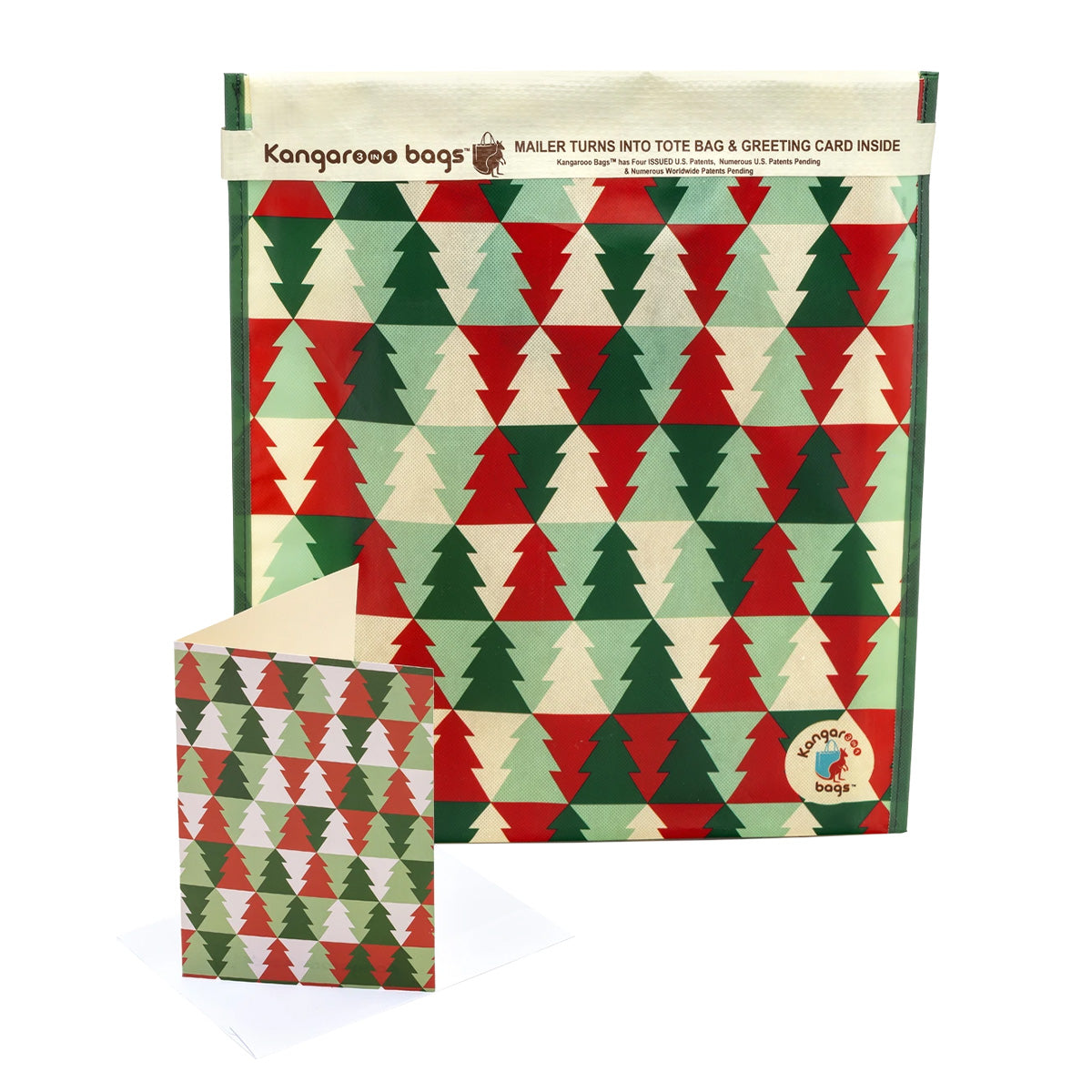 Deliver holiday cheer in style with the Evergreen Express! This large 3-in-1 Kangarooo Bag™ works as a tote bag, a reusable gift mailer, and includes a premium greeting card for the perfect festive package. Featuring a red, green, and cream Christmas tree houndstooth pattern, it’s built strong enough to handle shipping, rain, or the hustle and bustle of holiday gifting and still be reusable for seasons to come.