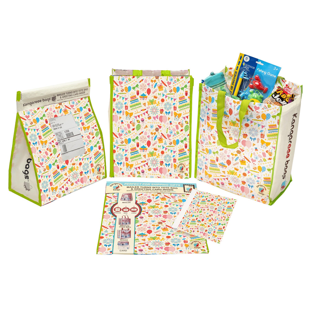 Celebrate in style with the Fiesta Flash! This medium Kangarooo Bag™ is your all-in-one party companion, tote bag, reusable gift bag, and greeting card. Bursting with colorful celebration designs and a pop of neon green, it’s perfect for birthdays, holidays, or just because. Durable enough to mail, easy to clean, and eco-friendly, this tote keeps the party hopping long after it’s unwrapped.